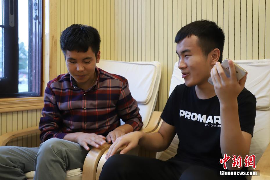 9月18日,盲人乐团成员用手机听旋律并与同学互相交流。当日,在贵州省惠水县的贵州盛华职业学院内,由12名视障或者盲人学生组成的贵州省首支盲人乐团排练,队员中年纪最小的14岁,年纪最大的35岁,他们虽然眼前黑暗,但勇于用音乐寻找光明。中新社记者 瞿宏伦 摄