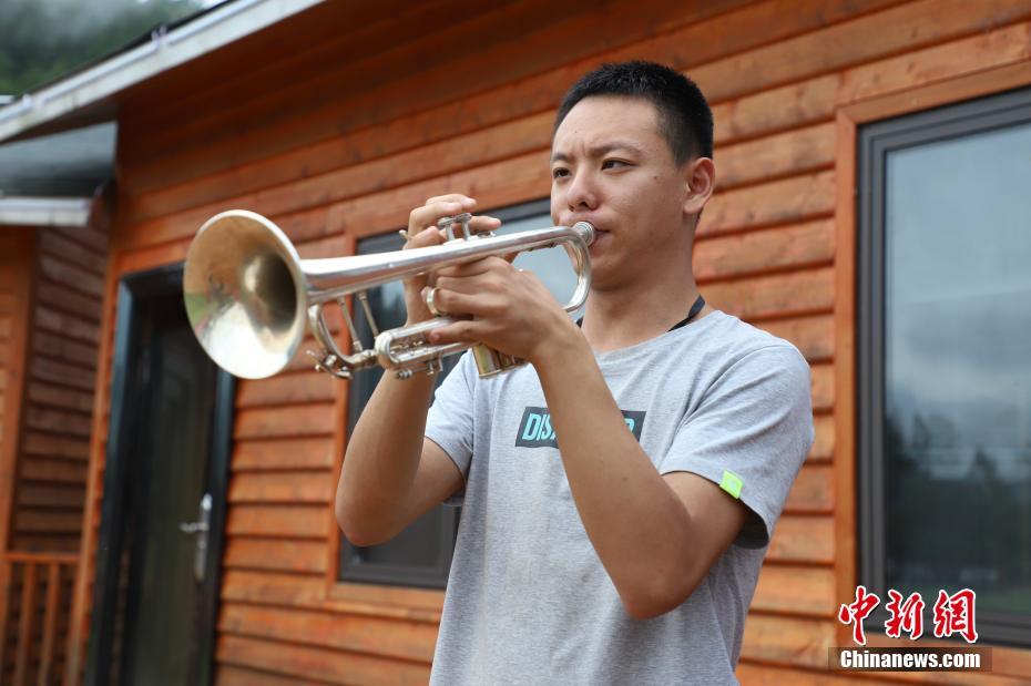 9月18日,盲人乐团小号手张晟在吹号。当日,在贵州省惠水县的贵州盛华职业学院内,由12名视障或者盲人学生组成的贵州省首支盲人乐团排练,队员中年纪最小的14岁,年纪最大的35岁,他们虽然眼前黑暗,但勇于用音乐寻找光明。中新社记者 瞿宏伦 摄