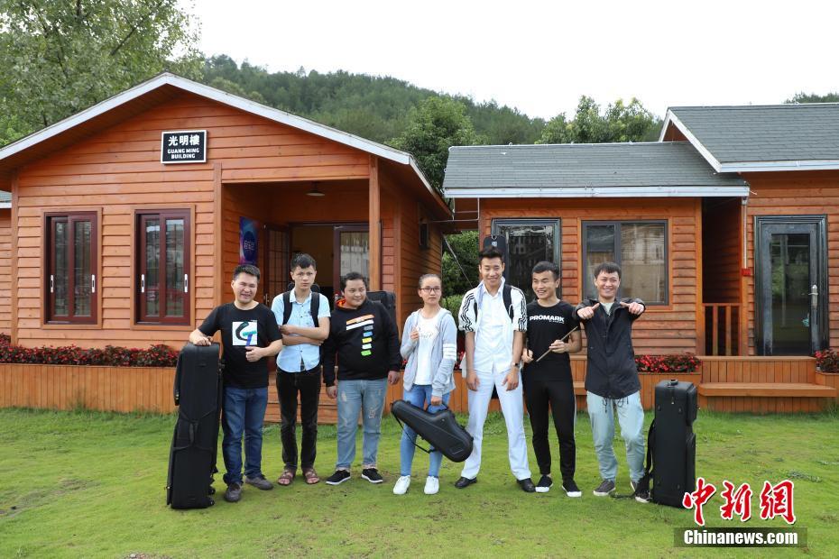 9月18日,盲人乐团部分成员在他们练习房前合影留念。当日,在贵州省惠水县的贵州盛华职业学院内,由12名视障或者盲人学生组成的贵州省首支盲人乐团排练,队员中年纪最小的14岁,年纪最大的35岁,他们虽然眼前黑暗,但勇于用音乐寻找光明。中新社记者 瞿宏伦 摄