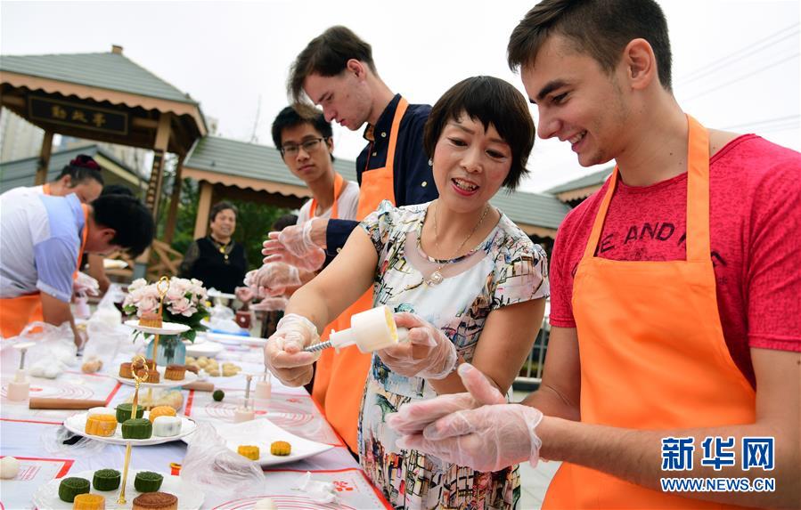 9月18日,在镇江市和平路街道金江社区,社区居民在指导来自乌克兰的留学生制作月饼。 当日,江苏省镇江市和平路街道金江社区联合江苏科技大学,开展“中外一家亲 欢乐迎中秋”活动。来自乌克兰的留学生与社区居民一起体验月饼制作,交流中秋习俗,喜迎即将到来的中秋佳节。 新华社发(石玉成 摄)