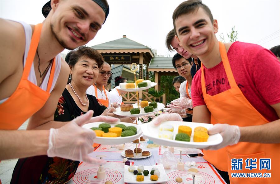 9月18日,在镇江市和平路街道金江社区,来自乌克兰的留学生(前)在展示制作的月饼。 当日,江苏省镇江市和平路街道金江社区联合江苏科技大学,开展“中外一家亲 欢乐迎中秋”活动。来自乌克兰的留学生与社区居民一起体验月饼制作,交流中秋习俗,喜迎即将到来的中秋佳节。 新华社发(石玉成 摄)