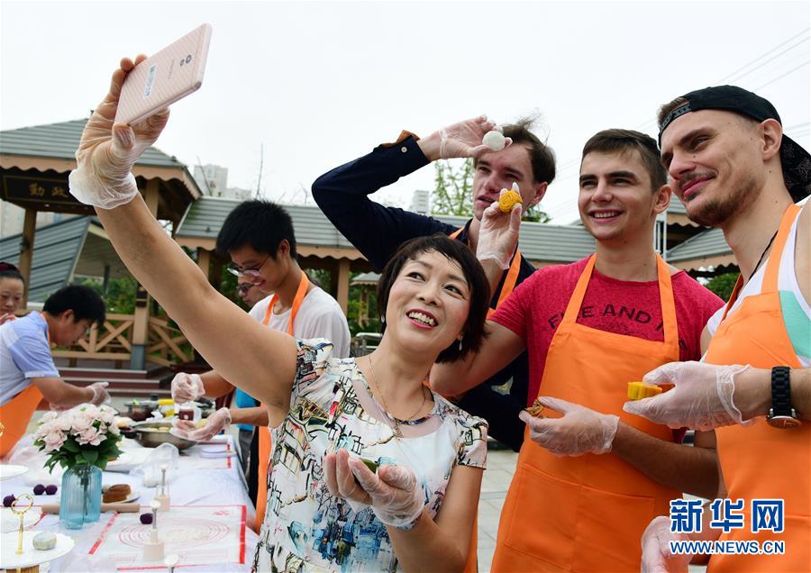 9月18日,在镇江市和平路街道金江社区,来自乌克兰的留学生和社区居民在月饼制作完成后自拍。 当日,江苏省镇江市和平路街道金江社区联合江苏科技大学,开展“中外一家亲 欢乐迎中秋”活动。来自乌克兰的留学生与社区居民一起体验月饼制作,交流中秋习俗,喜迎即将到来的中秋佳节。 新华社发(石玉成 摄)