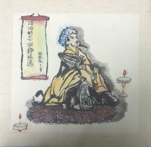 除去苏轼,小朋友爱画的还有“蜀汉丞相”诸葛亮,作为著名的历史人物,其“羽扇纶巾”的形象深入人心。所以在送交的国画作品中,手挥羽毛扇、头戴纶巾可以说成为了诸葛亮的“标配”。但是也有别出心裁者,在今年11岁的小朋友张祖伦为诸葛亮所创作的画像中,除了羽扇加上纶巾的经典形象,还在其旁画上了两盏点燃的油灯,似乎是借用了《三国演义》中“七星灯”的典故,对于三国的历史故事信手拈来。