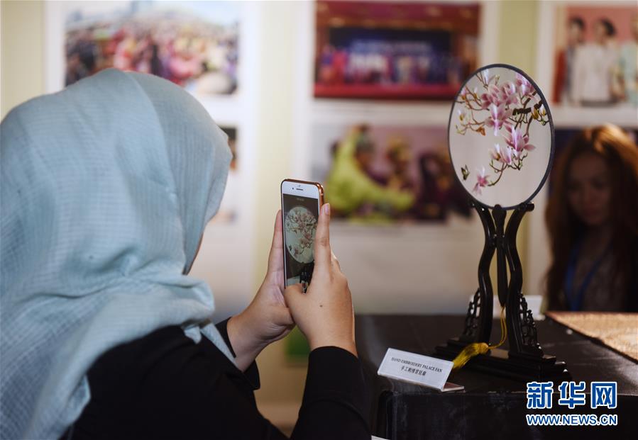 11月15日,在文莱首都斯里巴加湾市,一名参观者在“丝路华章”文化展上拍摄刺绣扇。 新华社发(王申摄)