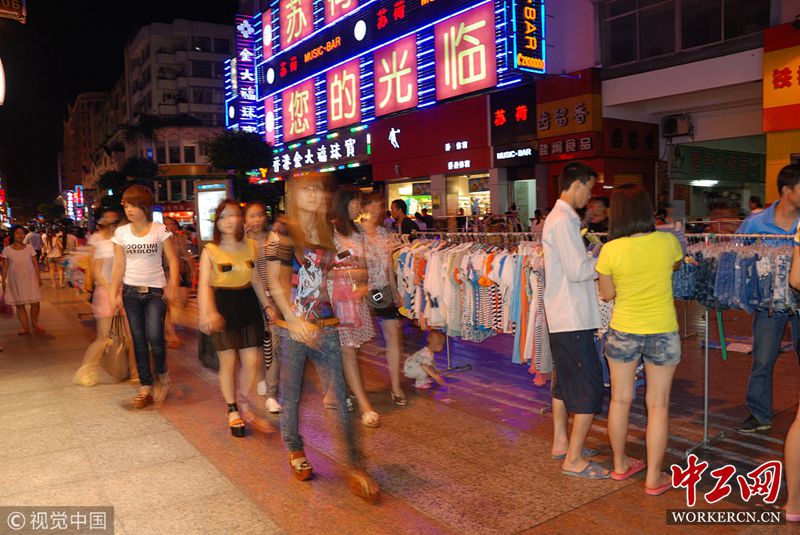 2012年07月21日,改造好后的广西河池市金城江区白马步行街,每晚22时以后允许在步行街街道上摆地摊:人头攒动的白马街苏荷音乐吧门前,有穿着拖鞋出行的情侣,有穿着厚底鞋(增高鞋)靓装逛街的美女。(图片来源:视觉中国)