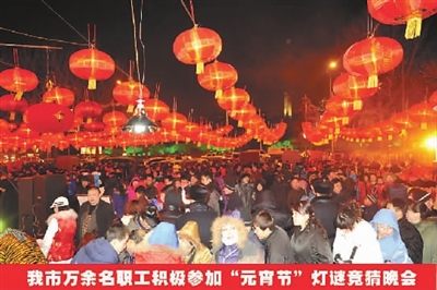 万余名长春职工参加工人文化宫举办的猜灯谜活动。