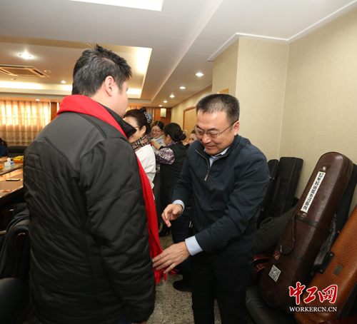 全总宣教部巡视员、全总文工团党委书记李庆忠为山水民乐艺术团团员佩戴红围巾