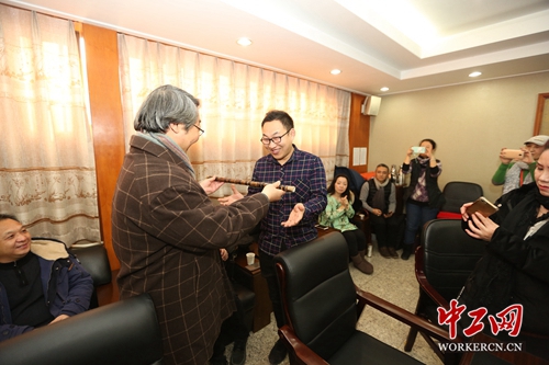 竹笛演奏家、全总文工团独奏演员(退休)、竹笛制作家史艳生向山水民乐艺术团副团长、竹笛演奏员仲辉乐赠送亲手制作的竹笛