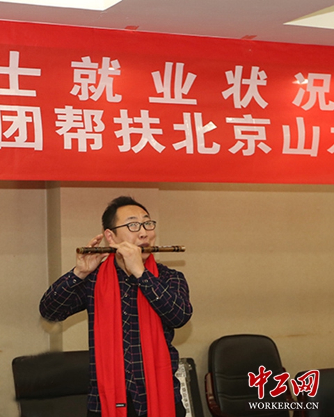 山水民乐艺术团副团长仲辉乐用刚刚收到的竹笛演奏
