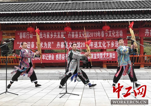 中工网讯 春节期间,贵州丹寨县文广局民族文工团的演员们走进兴仁镇翻仰村,为乡亲们带来迎新春文艺演出。