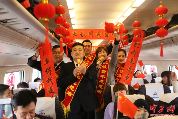 2月19日农历正月十五,在素有“草原号动车”之称的长春至乌兰浩特C1305次列车上,车内春意浓浓,大红灯笼高高挂起,五颜六色的窗花格外醒目,到处洋溢着节日的喜庆。11:38分,列车缓缓驶离长春站,“聚一份欢畅,聚一份吉祥,聚一份花好月圆的好时光”,伴随着列车工作人员演唱的《欢聚一堂》, 列车元宵活动正式拉开序幕。