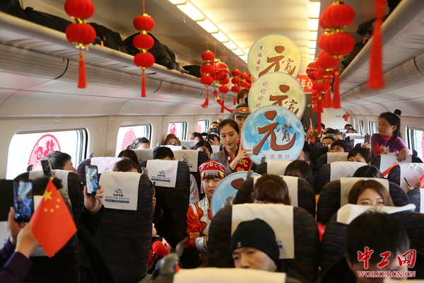 精彩的节目一个接着一个。蒙族歌曲《梦中的额吉》,让旅客感受到离家的孩子对母亲、对家乡故土的深深眷恋之情。青年志愿者和学生们演绎的街舞“青春律动”,迎来潮水般的掌声和叫好声;三名乘务员小伙子们将建国70年来取得的成绩和新时代新变化编成了快板书,铿锵竹韵和生动的语气, 勾起人们对祖国山河的向往和美好生活的热爱。