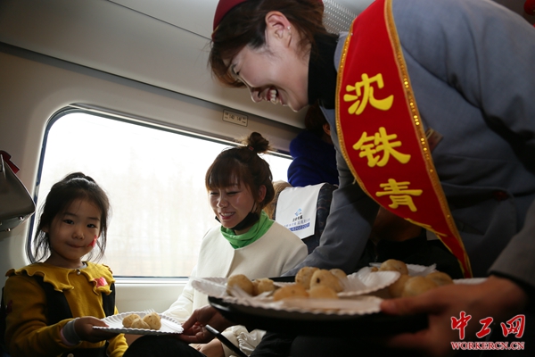 图为列车工作人员为旅客送元宵