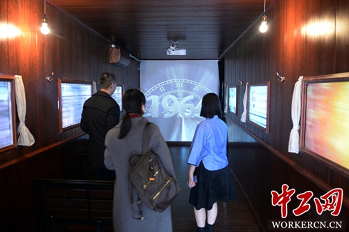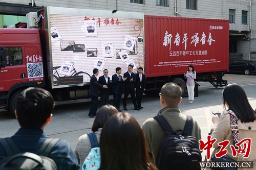 现场展示的两列“时光列车”,由两辆东风卡车承载。两个集装箱内,参观者可以“穿越时光”,感受五四百年来的巨变。