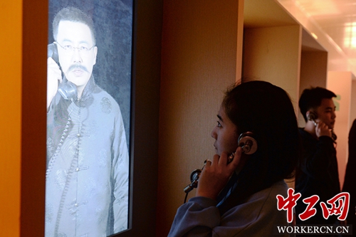 第二个集装箱被装饰为候车大厅,布置有多个老式电话,参观者拿起电话将接到五四先驱们有关时代和人生的讲述。