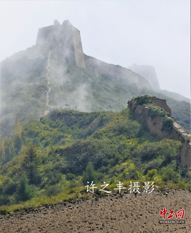2019年9月12日,踏上明长城广武段,这里据史书和碑文记载,是明代洪武七年(1374年)修筑,属内长城,全长约20华里,土墙尚存13公里,剩余部分为残迹,保存较完整的在山西省山阴县新广武境内。沿山脊缓行,随山势的曲折而起伏,宛如首尾不见的巨龙。自古就有“广聚武将之地、兵家必争之地、咽喉要塞之地”的称谓。图为明长城广武段。工人日报-中工网许之丰摄影报道