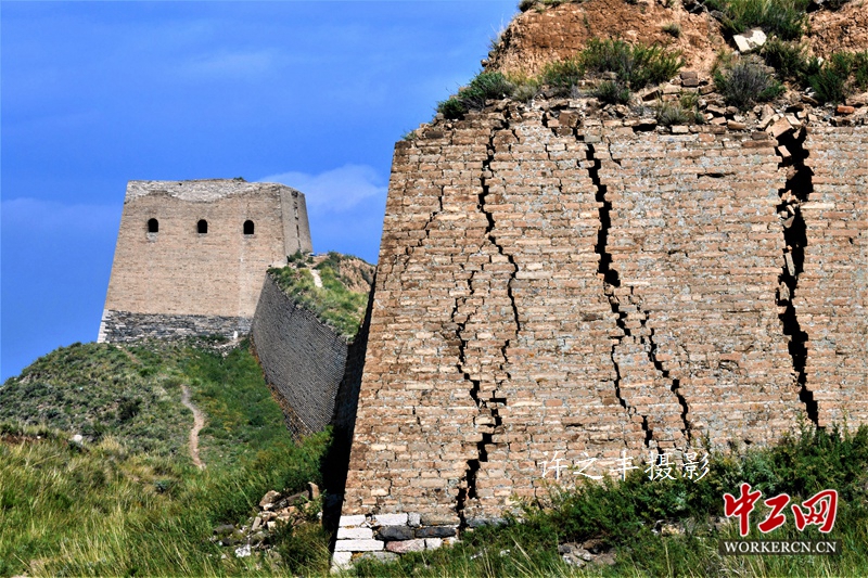 2019年9月12日,踏上明长城广武段,这里据史书和碑文记载,是明代洪武七年(1374年)修筑,属内长城,全长约20华里,土墙尚存13公里,剩余部分为残迹,保存较完整的在山西省山阴县新广武境内。沿山脊缓行,随山势的曲折而起伏,宛如首尾不见的巨龙。自古就有“广聚武将之地、兵家必争之地、咽喉要塞之地”的称谓。图为明长城广武段。工人日报-中工网许之丰摄影报道