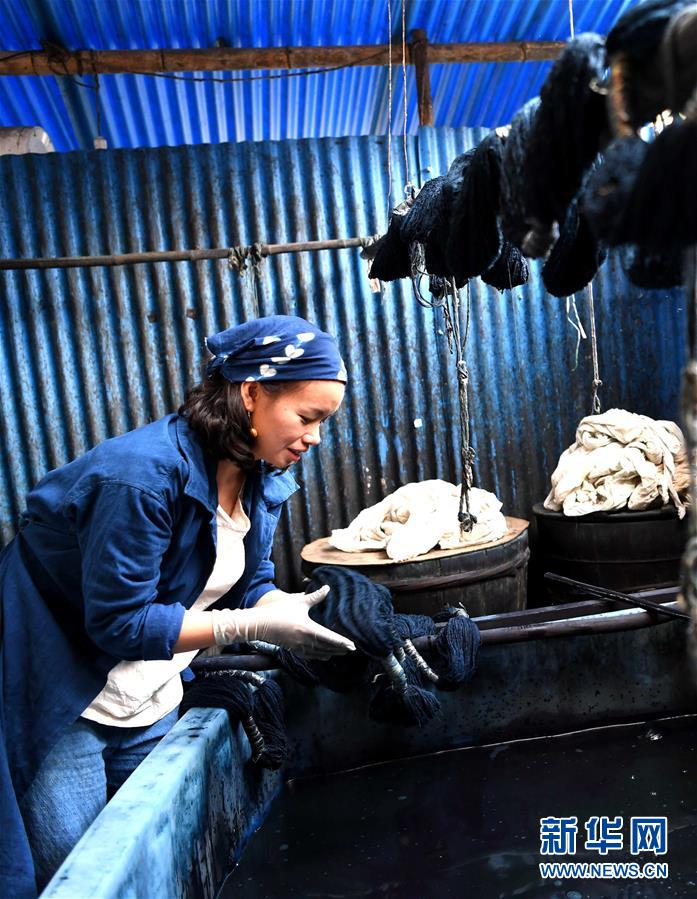4月12日,杨成兰用传统植物染料染纱。新华社发(王炳真 摄)