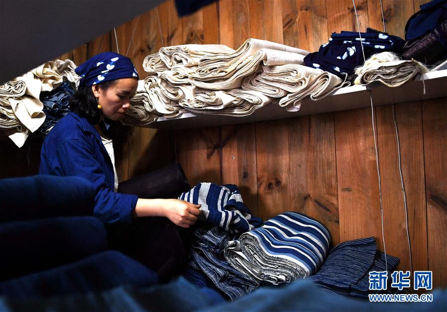 4月12日,杨成兰在工作室里整理侗族土布。新华社发(王炳真 摄)