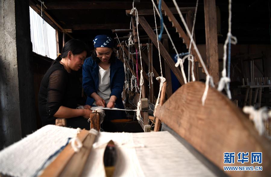 4月12日,杨成兰(右)和一名侗族妇女探讨侗族土布制作。新华社发(王炳真 摄)