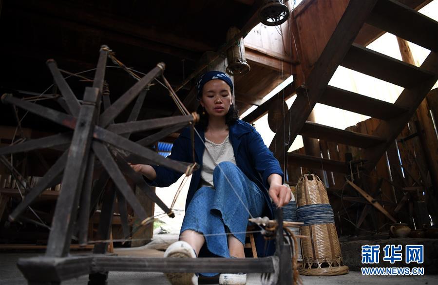 4月12日,杨成兰在家里用传统纺纱车纺纱。新华社发(王炳真 摄)