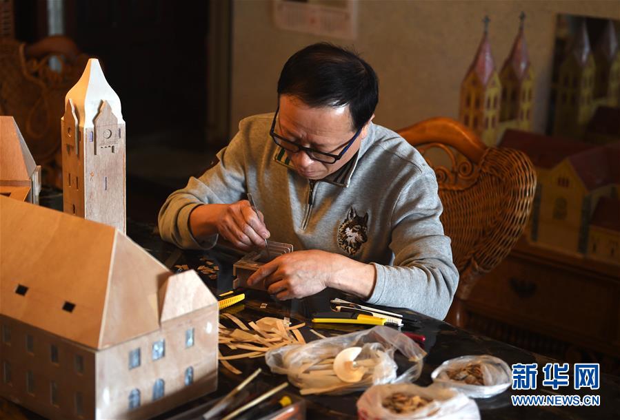 4月12日,纪周统在用贝壳制作微缩版特色建筑。新华社记者 李紫恒 摄
