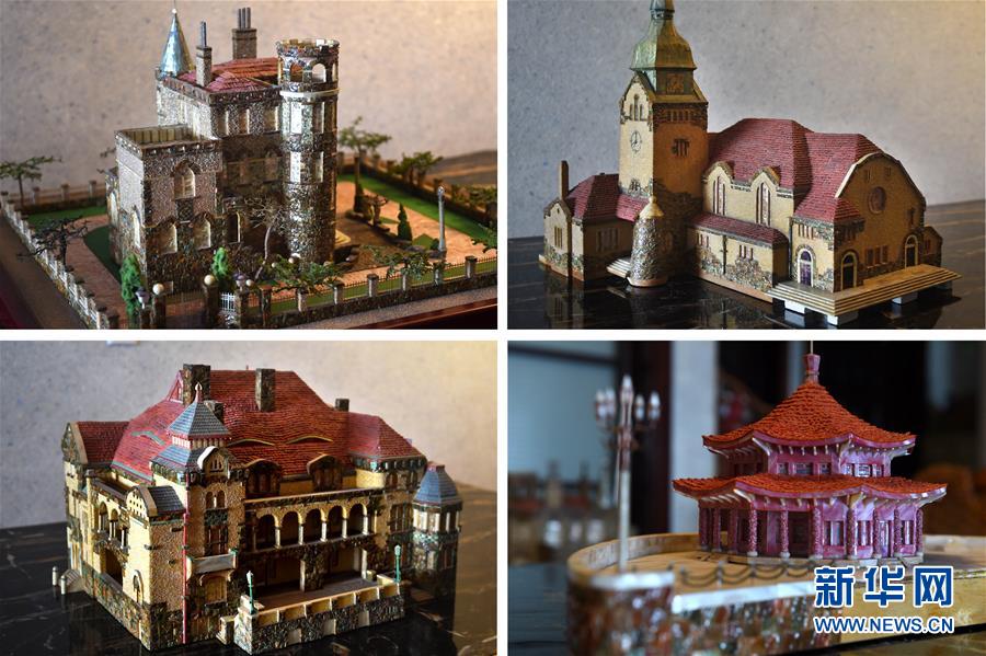 这是4月12日拍摄的纪周统部分贝壳建筑作品:花石楼(左上)、基督教堂(右上)、总督府(左下)、栈桥(右下)。新华社记者 李紫恒 摄