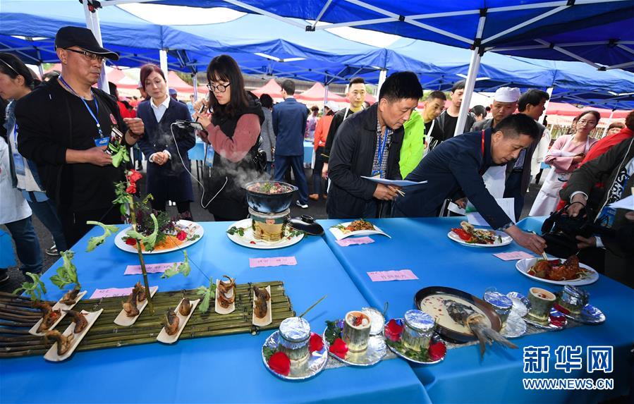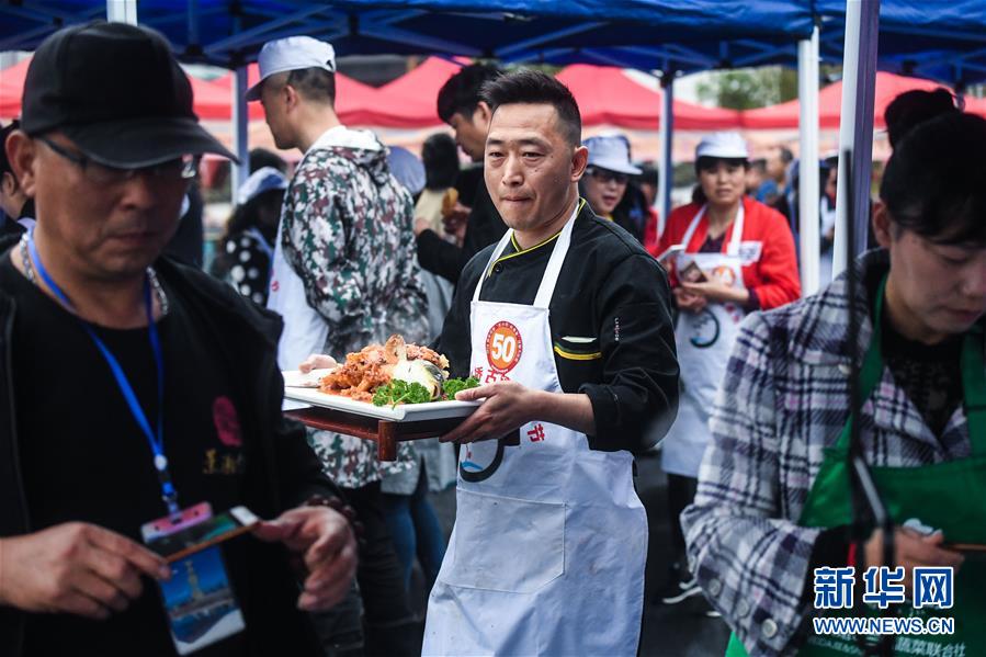 4月13日,乡村大厨把烹制好的特色菜端到展示台,准备参加评选。新华社记者徐昱摄