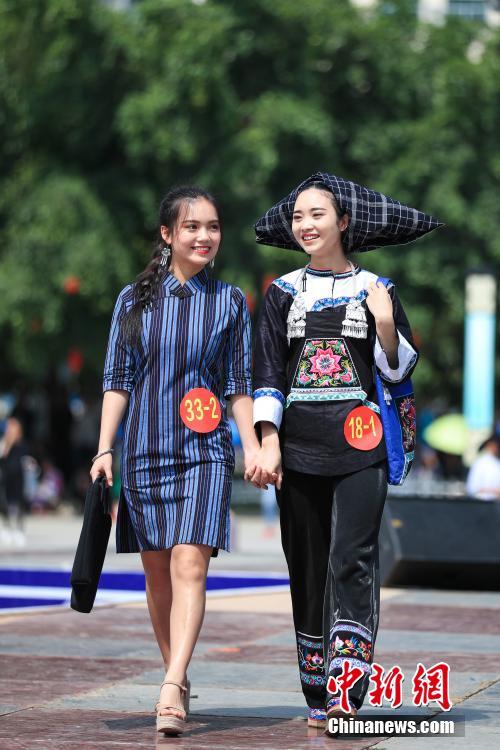 4月17日,贵州省望谟县,模特在展示布依族绣娘设计的闺蜜装。当日,贵州省望谟县举办2018年“三月三”布依族文化节“锦绣布依”服饰设计大赛,集中展示该县布依族绣娘71件设计作品,绣娘们选用布依族的特色元素与现代服饰设计的时尚融合,再现传统手工技艺的精妙,展示布依族传统服饰之美。 中新社记者 贺俊怡 摄