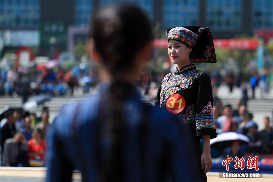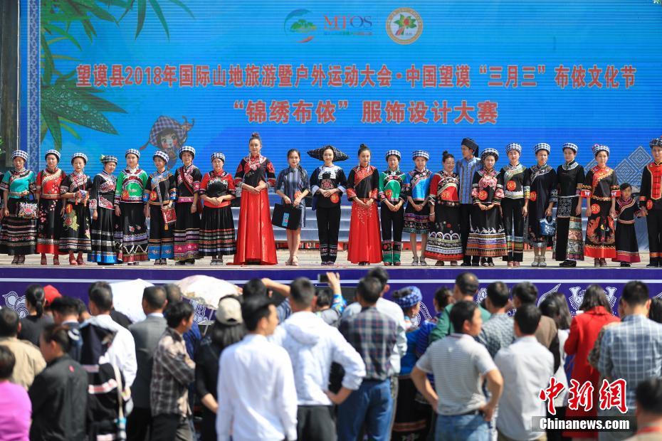 4月17日,贵州省望谟县,模特在展示布依族服饰。当日,贵州省望谟县举办2018年“三月三”布依族文化节“锦绣布依”服饰设计大赛,集中展示该县布依族绣娘71件设计作品,绣娘们选用布依族的特色元素与现代服饰设计的时尚融合,再现传统手工技艺的精妙,展示布依族传统服饰之美。 中新社记者 贺俊怡 摄
