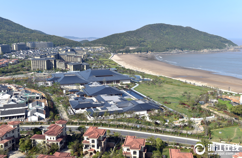 2018年4月17日,大片青色屋顶的“舟山最美会客厅”正对朱家尖东沙海滩。(浙江在线记者 潘海松 摄)