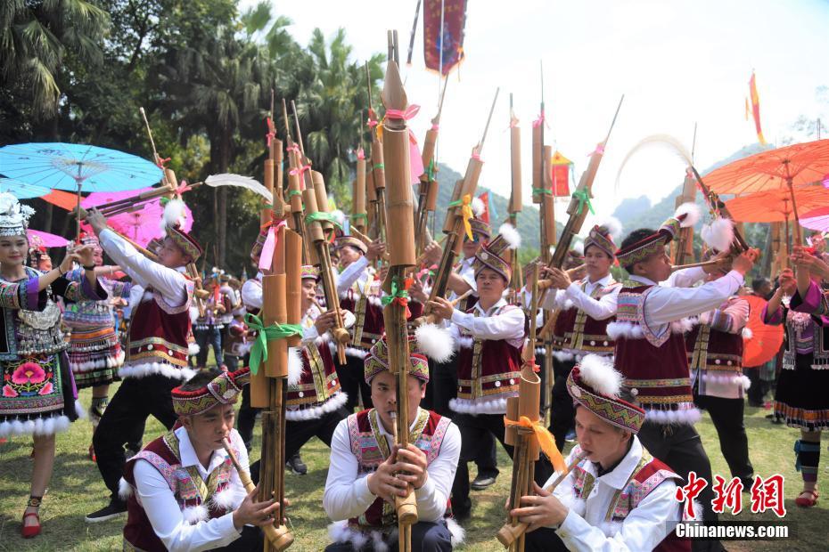 4月18日是广西壮族传统节日“三月三”,在广西柳州市龙潭公园里,来自附近各县的共22支芦笙队、超过1000名各族群众进行芦笙演奏和多耶表演,庆祝传统节日,吸引了上万名市民前来观看。王以照 摄