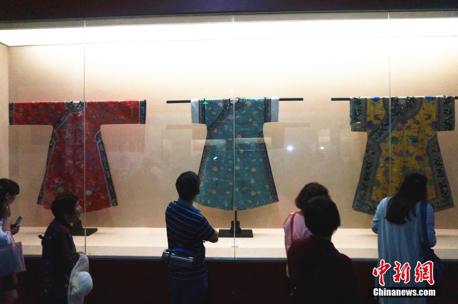 观众在欣赏具有牡丹纹饰的清朝服饰。韩章云 摄