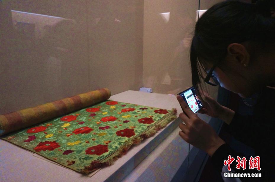 观众在欣赏此次特展的展品葱绿色缠枝牡丹纹漳缎。韩章云 摄
