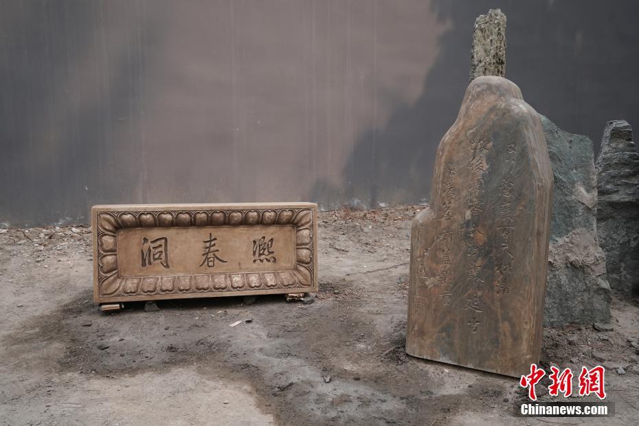 4月19日,两件圆明园流散文物乾隆御笔“熙春洞”石匾额和嘉庆御笔“称松岩”诗刻石从位于北京东厂胡同的民盟中央翠园启程“回家”。据介绍,乾隆御笔“熙春洞”石匾额曾安放在圆明园泽兰堂翠交轩前的石室洞门上,而嘉庆御笔“称松岩”诗刻石曾安放在圆明园的如园。两件文物现所在的翠园位于翠花胡同内太平胡同一古宅。该宅始建于明代,清代曾为王府,1949年3月5日民盟总部从香港迁至此后便成为民盟中央所在地。此次,双方经接洽协商后再度达成一致,并最终促成了两件流散石刻文物的回归。图为圆明园赠予民盟中央的两件流散文物的复制品。中新社记者 崔楠 摄