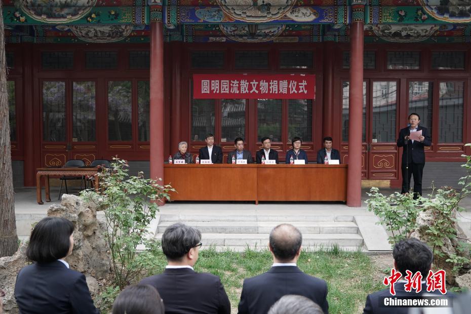 4月19日,两件圆明园流散文物乾隆御笔“熙春洞”石匾额和嘉庆御笔“称松岩”诗刻石从位于北京东厂胡同的民盟中央翠园启程“回家”。据介绍,乾隆御笔“熙春洞”石匾额曾安放在圆明园泽兰堂翠交轩前的石室洞门上,而嘉庆御笔“称松岩”诗刻石曾安放在圆明园的如园。两件文物现所在的翠园位于翠花胡同内太平胡同一古宅。该宅始建于明代,清代曾为王府,1949年3月5日民盟总部从香港迁至此后便成为民盟中央所在地。此次,双方经接洽协商后再度达成一致,并最终促成了两件流散石刻文物的回归。图为文物捐赠仪式现场。中新社记者 崔楠 摄