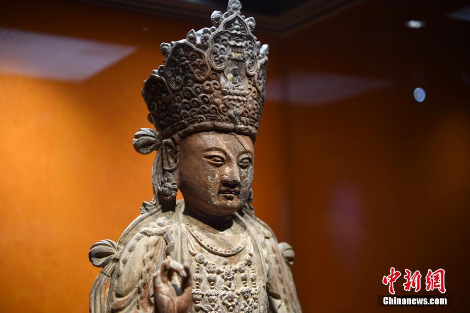 4月20日,现场展出的明代木雕普贤菩萨骑象像。当日,“妙香秘境——云南佛教艺术展”在位于昆明市的云南省博物馆开展,本次展览共展出佛教文物精品114件(套),其中国家一级珍贵文物数量近一半。展览从艺术史的角度展示云南独有的南诏大理国佛教、汉传大乘佛教、藏传金刚乘佛教和南传上座部佛教文物。 中新社记者 刘冉阳 摄