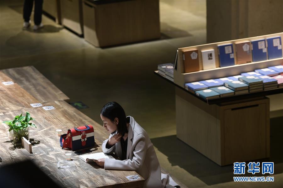 4月19日,一名读者在西宁市几何书店内阅读书籍。看书、画唐卡、磨青稞、做木工、打银饰……走进青海西宁的几何书店,穿过一道道灰白色的石拱门,读者或在长椅上安静阅读,或在画师指导下画一幅唐卡,或握起木槌和手工凿,做一次木工……在书店中体验别样的文化和生活,感受舒适阅读。新华社记者吴刚摄