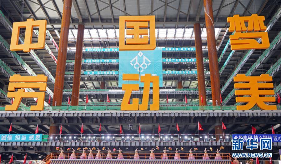 4月24日,舞蹈演员在节目录制现场跳舞。当日,由中华全国总工会、中央广播电视总台联合举办的“中国梦·劳动美”——2018年庆祝“五一”国际劳动节心连心特别节目在北京亚洲基础设施投资银行总部永久办公场所建设工地录制,全国和北京市劳模代表、建设工地职工等1000余人在现场观看演出。该特别节目设吉林长春、北京两个会场,将于5月1日晚黄金时段播出。新华社记者才扬 摄