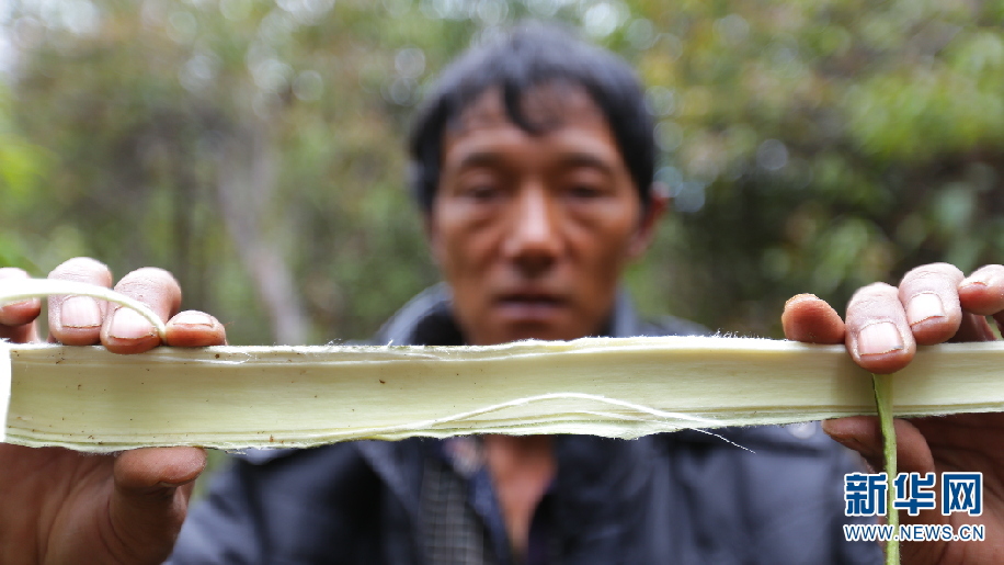 展示东巴纸原材料“那瓦树”树皮。新华网 潘越 摄