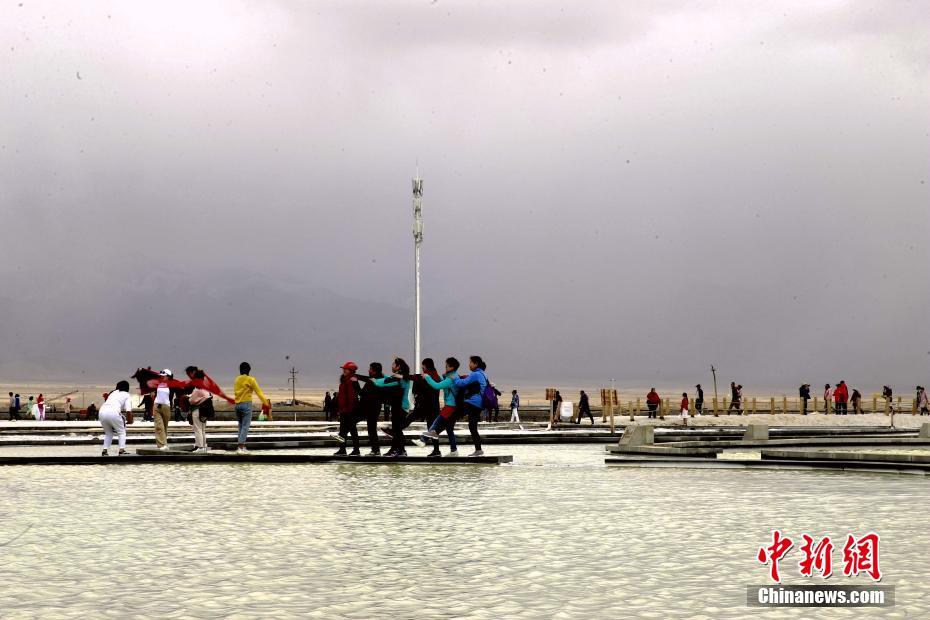 4月26日,历经6个月封闭升级改造的青海茶卡盐湖开始迎客,游客踏入卤水湖及盐雕群,畅享中国版“天空之镜”。图为游客在盐湖拍照。 中新社记者 张添福 摄