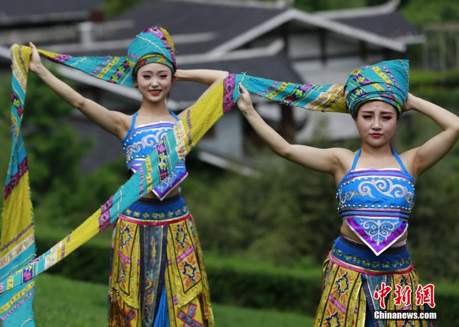 5月3日,湖南张家界武陵源黄龙洞风景区的青年员工身着盛装,上演了一场精彩的苗族头帕秀,喜庆五四青年节的到来。吴勇兵 摄