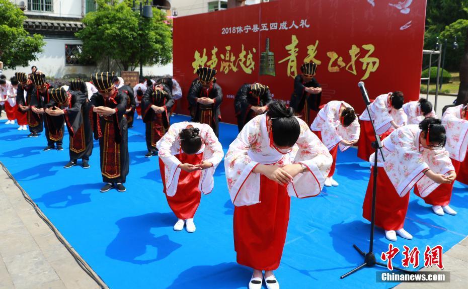 当日,休宁县中学生代表身着大气优雅的朱子深衣和袄裙,通过“加笄加冠”、“礼拜师长”、“诵读《朱子家训》”等仪式,亲身感受古华夏传统礼仪,宣告成年。 图为受礼者礼拜天地。 (文字 张娅子/图 陈佳)