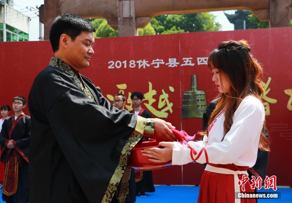 据了解,冠笄之礼是汉民族传统的成人仪礼,也是重要的人文遗产。男子的成人礼称作冠礼,女子的成人礼称作笄礼。图为正宾在沃盥。 (文字 张娅子/图 陈佳)