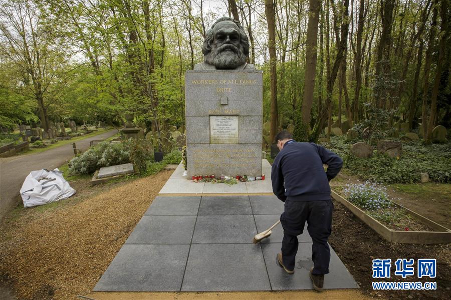 5月3日,在英国伦敦北部海格特公墓,一名工人在清扫马克思墓前的大理石板。 2018年5月5日是马克思诞辰200周年纪念日。新华社发(蒂姆·爱尔兰 摄)