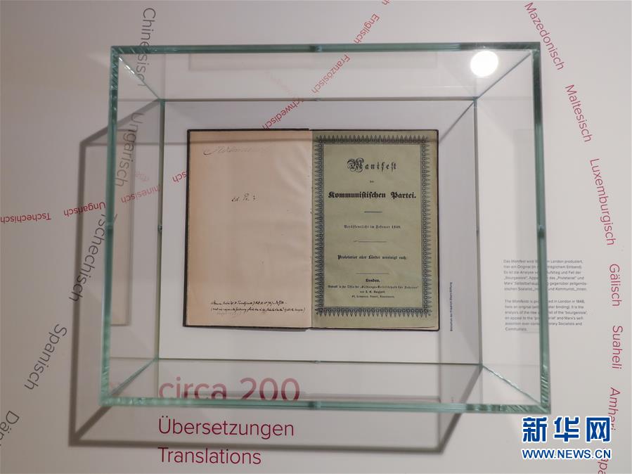 这是5月3日在德国特里尔马克思故居纪念馆内拍摄的1848年出版的《共产党宣言》第一版。新华社记者单宇琦 摄