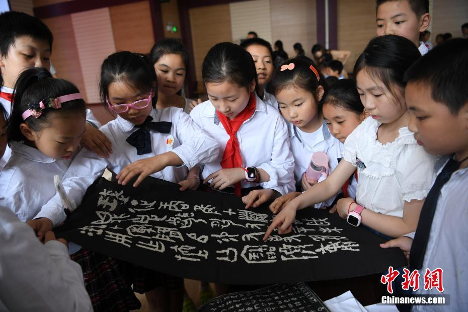 5月8日,重庆南开小学的学生们在“甲骨文学堂”进校园活动中识别甲骨文及练习甲骨文书法。当日,由重庆市沙坪坝区图书馆、重庆甲骨文字社合作开展的“甲骨文学堂”进校园活动来到重庆南开小学,向小朋友们介绍甲骨文知识、教授甲骨文书法,让孩子们感受中华文化魅力。图为图书馆工作人员为小朋友们展示甲骨文。 陈超 摄