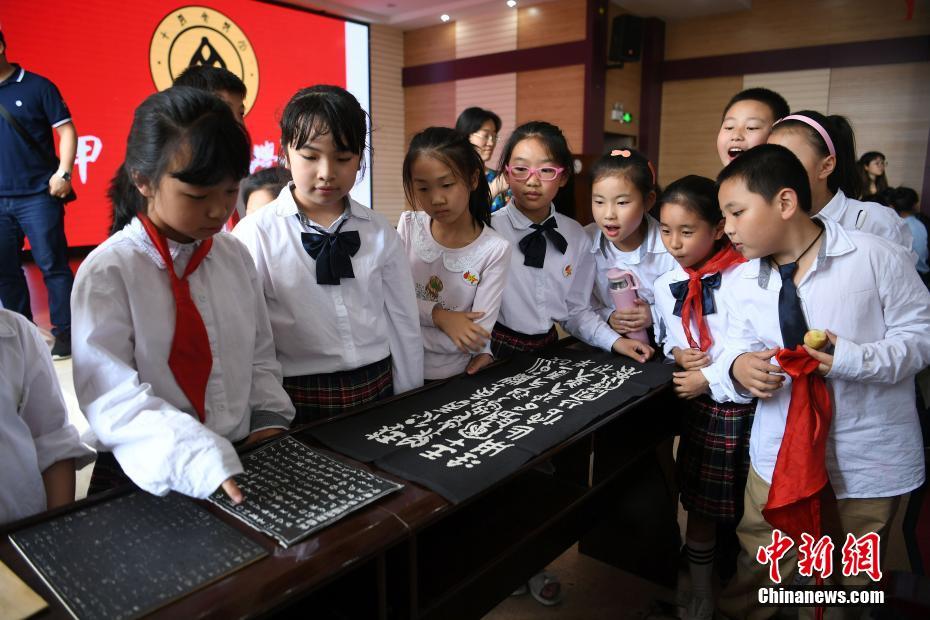 5月8日,重庆南开小学的学生们在“甲骨文学堂”进校园活动中识别甲骨文及练习甲骨文书法。当日,由重庆市沙坪坝区图书馆、重庆甲骨文字社合作开展的“甲骨文学堂”进校园活动来到重庆南开小学,向小朋友们介绍甲骨文知识、教授甲骨文书法,让孩子们感受中华文化魅力。图为学生们欣赏甲骨文书法作品。 陈超 摄