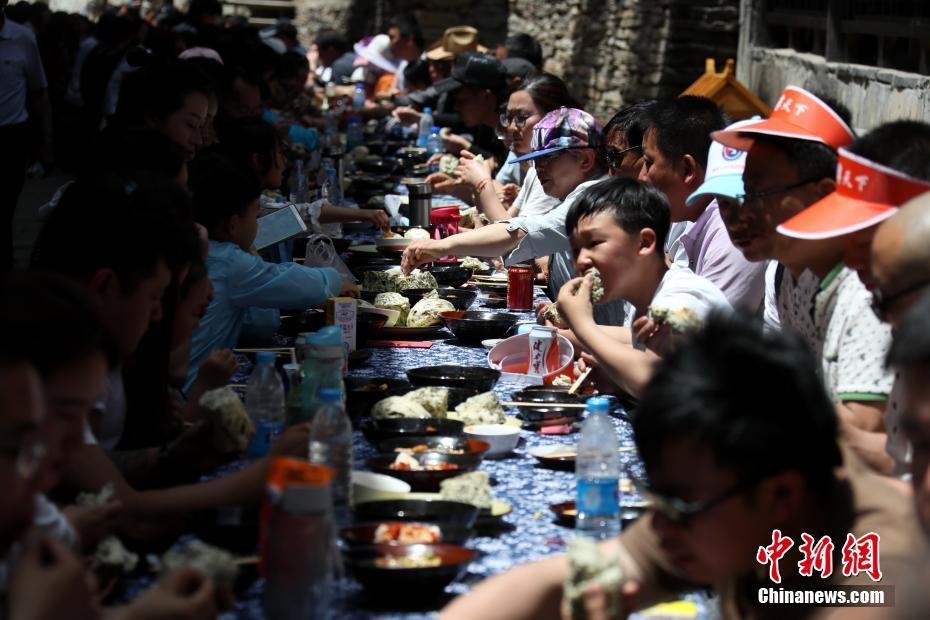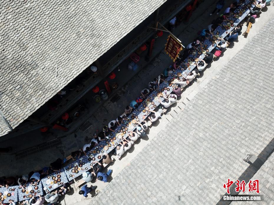 5月13日,河南洛阳抱犊寨古寨风情旅游节开幕,主办方摆下长桌宴免费邀民众品尝。中国传统民居建筑的脊坡式瓦房与长桌宴似三条直线绵延而去,形成了一道亮丽的风景,让前来参加长桌宴的民众感受到了古寨文化的无穷魅力。 王中举 摄