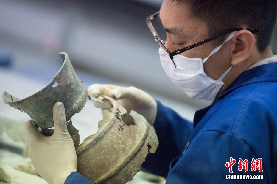 5月14日,国际博物馆日前夕,在位于太原市的山西博物院文物保护中心,50余名文物修复师分别对大量的古代壁画、青铜器、书画进行精心修复,工作量繁重。中新社记者 韦亮 摄